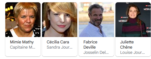 Nous allons vous détailler les deux acteurs principaux, à savoir Mimie Mathy et Mathieu Delarive. Pour al liste des autres acteurs et actrices, la voici :
