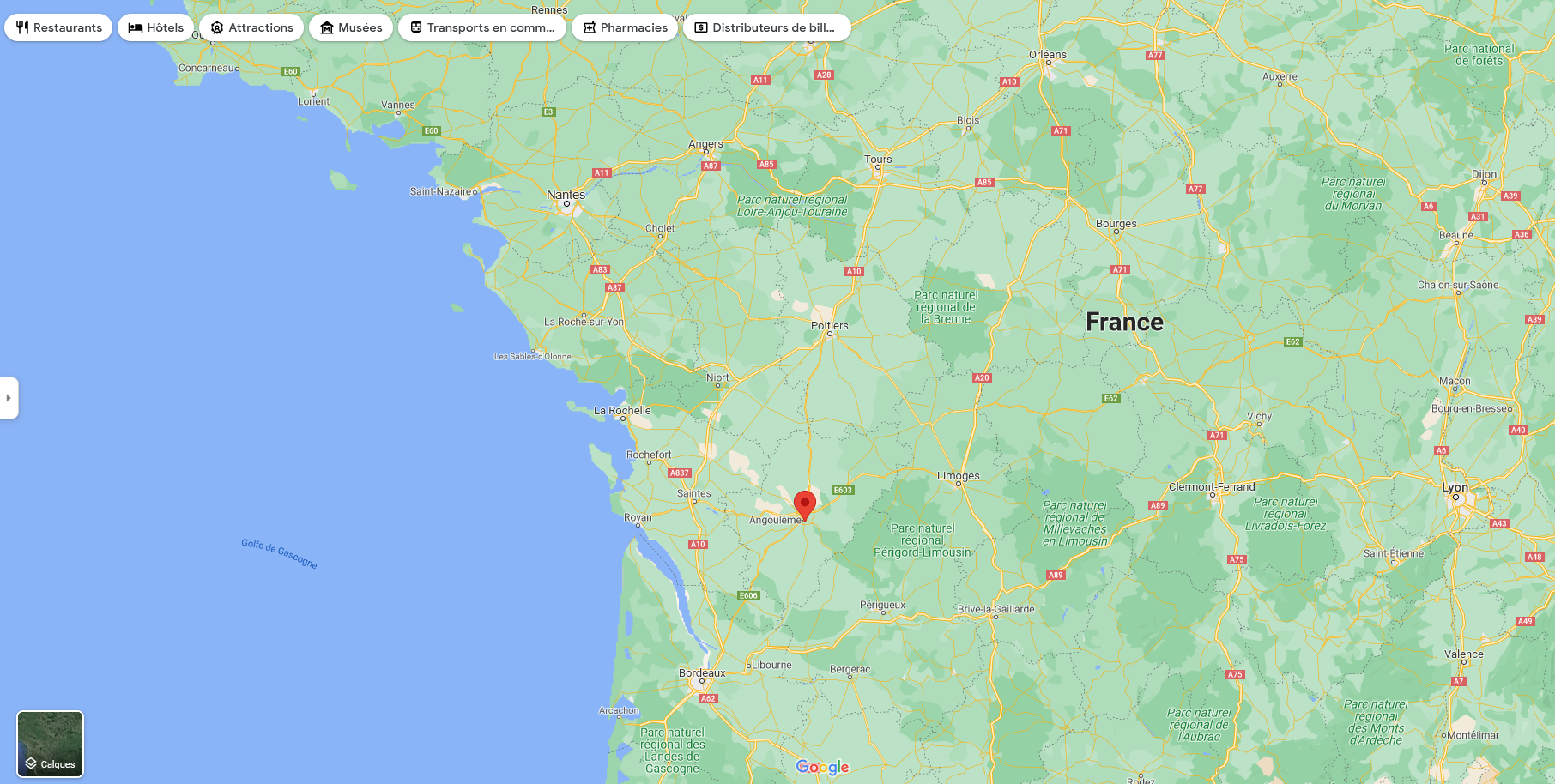 La ville d'Angoulême se situe à cet endroit en France, dans le sud (source : Maps)